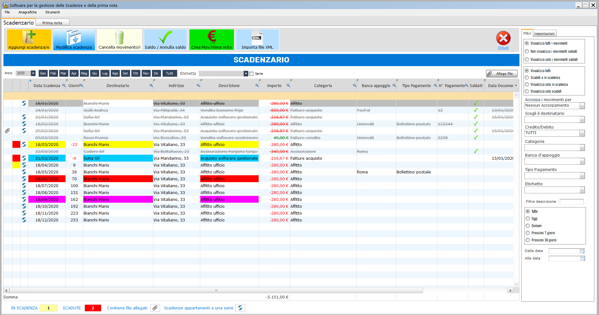 | | Il programma gestisci con facilità le scadenze, è possibile inserire i crediti e i debiti il programma ti avvisa visualizzando un messaggio sulle attività in scadenza o già scadute ogni 20 minuti. Puoi inserire documenti in scadenza, fatture ricevute o qualsiasi altra scadenza economica, puoi inserire la data e il numero del documento, puoi inserire qualsiasi tipo di scadenza per credito o debiti.